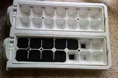 They had nice detailed instructions at the back – unlike the Indian seed packets I’ve bought till now. Last time I germinated my seeds in eggshells, but I didn’t have any immediately at hand today. I’ve started crushing them and composting the ones I use and had none to spare. So after looking around desperately, I found the only thing at hand was an ice cube tray. I soaked eight seeds for an hour, filled eight slots in the tray with compost and then inserted the seeds into the center of each.
